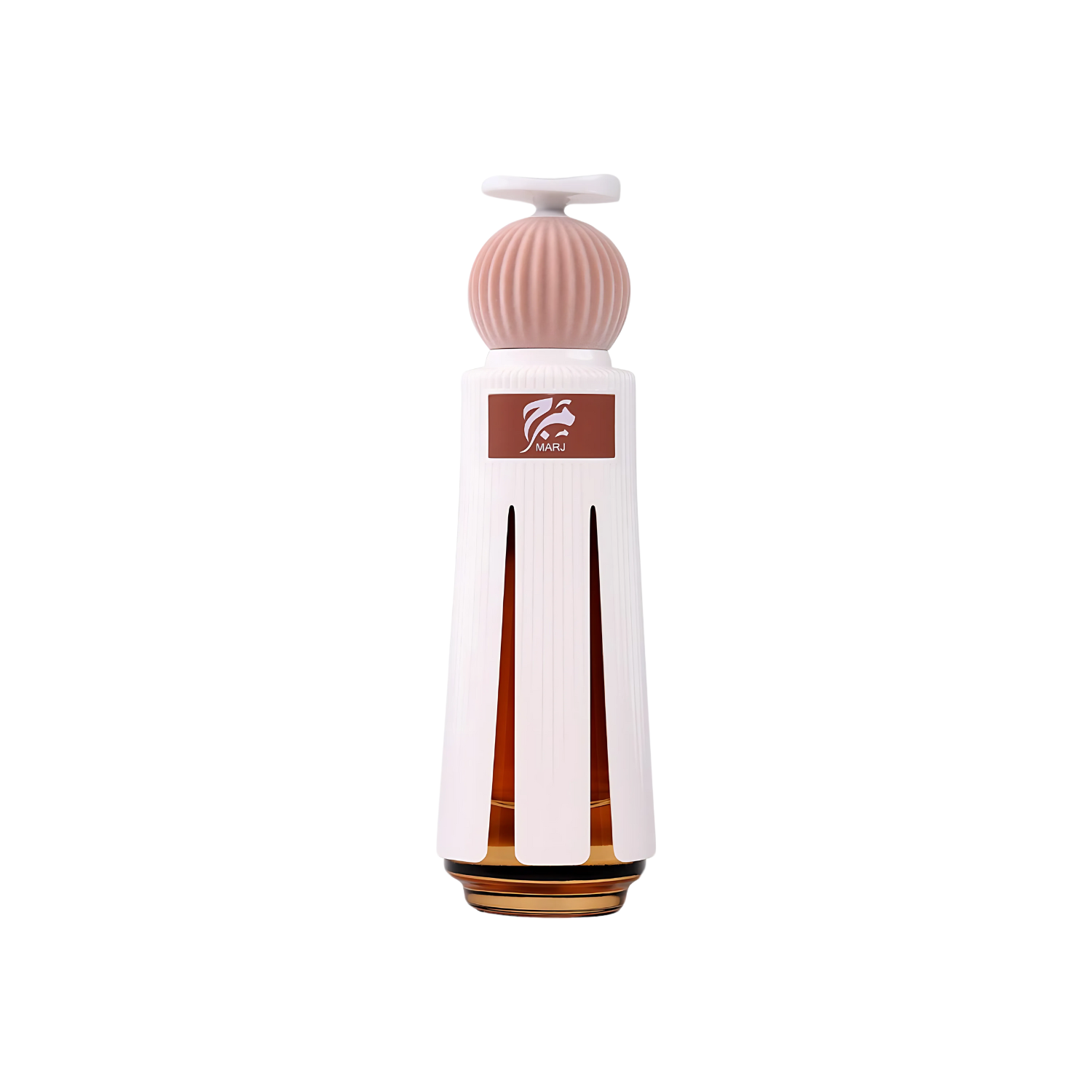 يتميز الصندوق بغطاء مخملي بلون الأمارلس ليمنحك إحساسًا بالفخامة. عند رفع الغطاء، تظهر مزهرية جميلة، تعلوها تصميم مميز. أجنحة بيضاء تشبه زهرة التوليب تتدلى إلى الجذع، كاشفةً عن فجوات في الزجاج، وفي المنتصف، نقش اسم "MARJ"، عطرٌ صُمم ليجسّد الفخامة.
