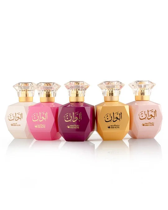 Alwan Collection consisting of five women's perfumes The first perfume consists of jasmine and orange flower with a soft touch of musk. The second perfume takes you on a refreshing aromatic journey with the scent of lemon and mixed with the beauty of roses and the scent of vanilla. The third perfume embodies a wonderful harmony of berries, jasmine, cedar wood and the luxury of amber, creating a unique aromatic experience. The fourth perfume takes you on an enchanting journey with the luscious scent of coconut and the beauty of orchid and patchouli. The fifth perfume captivates the senses with hints of luxurious cashmere and the allure of white musk with touches of woody scents. Gift Bag