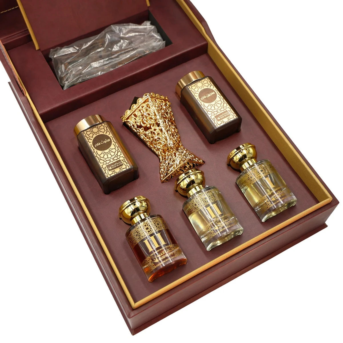 The unique and elegant Laylate Plus Romance Set, with a distinctive set of three perfumes, a luxurious Mabthooth and Majon, and a crystal incense burner in perfect harmony that reflects authenticity