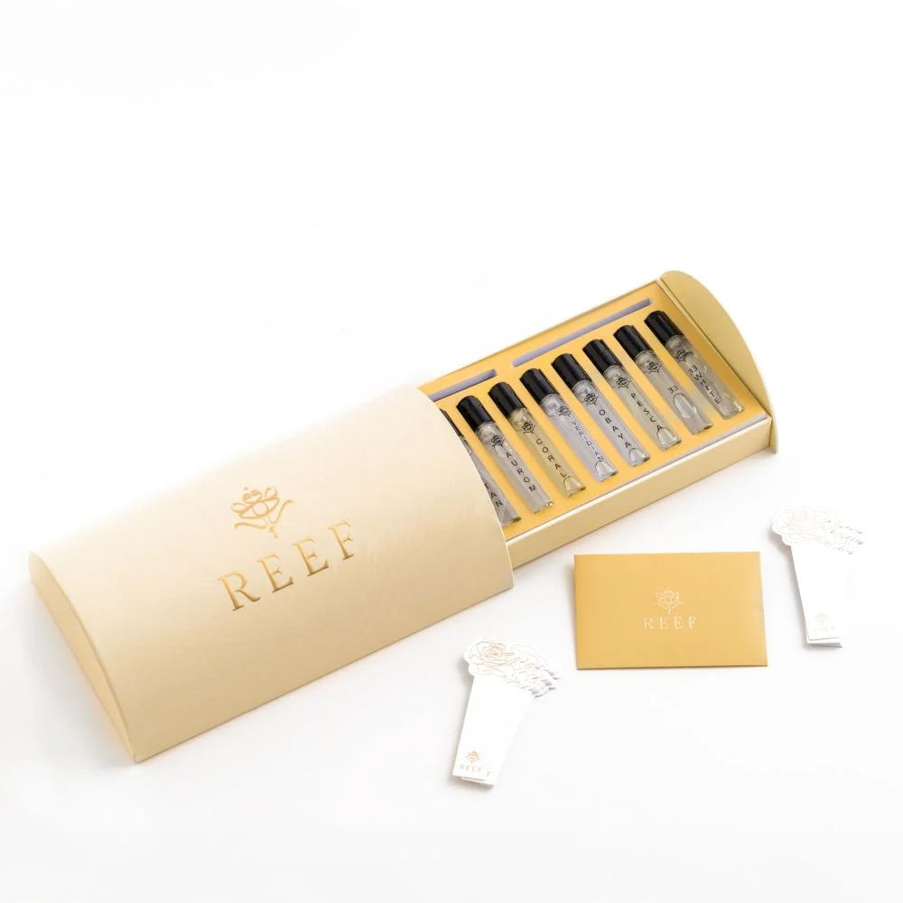 Experience a curated journey that unfolds in one elegant box — the REEF Sample Collection, featuring 10 miniature perfumes (3 ml each) from the House of the East, blending heritage and modernity in perfect harmony.