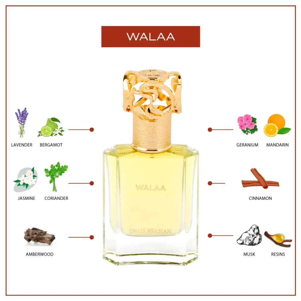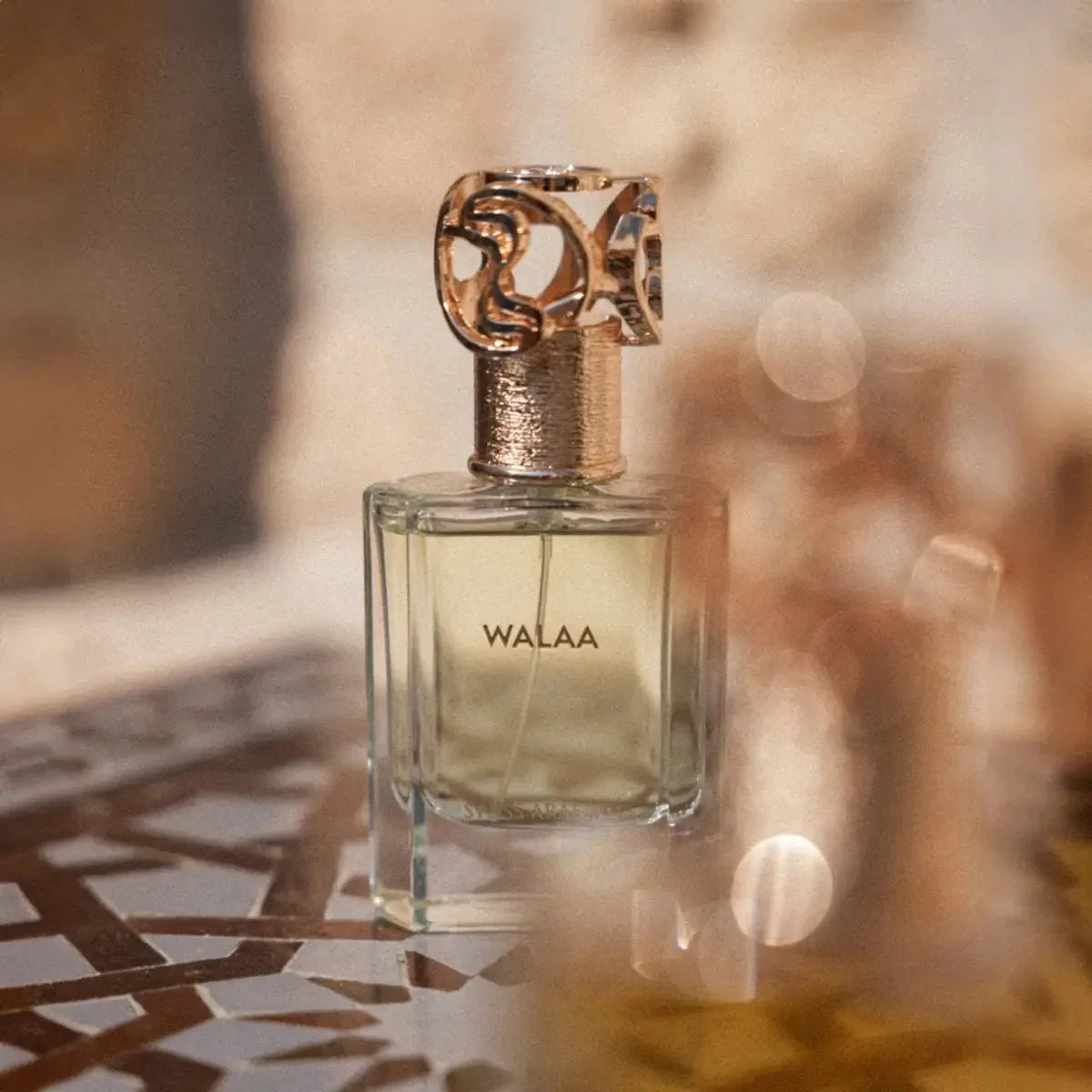 Walaa means fondness. This citrus, aromatic fragrance has been created to encapsulate the uplifting heights of happiness when deep love engulfs you. Walaa opens in the traditional style of fougère, with the classic notes of lavender and geranium. Blending seamlessly with sharp mandarin and bergamot, the start of this fragrant journey evokes blue skies and sunshine. The feel-good factor is enhanced with the fresh-air scent of hedione and white jasmine. Spring-like violets and cozy cinnamon beckons, adding beauty and warmth to the heart of the scent. A welcoming forest embraces you with the velvety strength of its woody notes. Fir balsam, Amberwood, golden ambroxan and a swirl of sensuous musk tell the tale of this deep love. Deep in love.